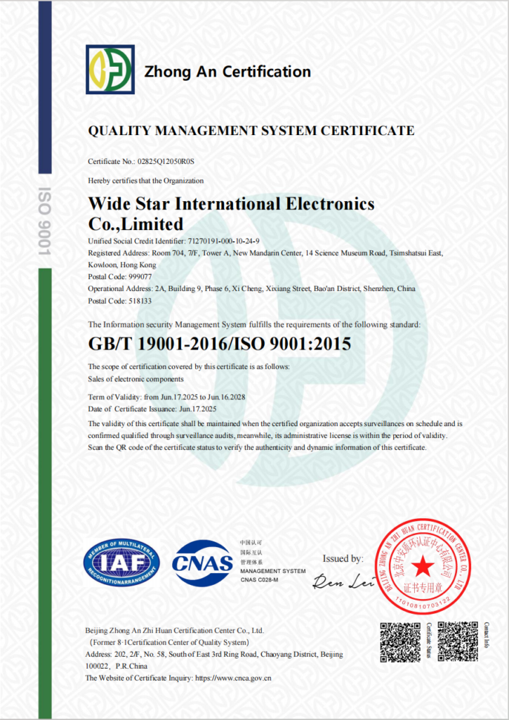 At widestarelec, we understand that quality is the foundation of trust in the electronic components industry. That’s why we are proud to be ISO 9001:2015 certified, demonstrating our commitment to consistent, high-quality operations across sourcing, warehousing, and customer service.
